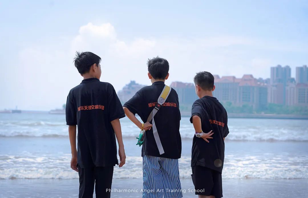在离开之日,客车启动,张文慧校长带领收获满满的孩子们来到了沙滩上。因为之前几天的学习和演出比赛实在是太过充实和紧张,以至于孩子们虽然住在海边,但都没有出过会场大门感受美好的海景。孩子们下车后在沙滩上恣意地奔跑,无人机在天空上记录下这群爱乐天使少年阳光朝气的模样。