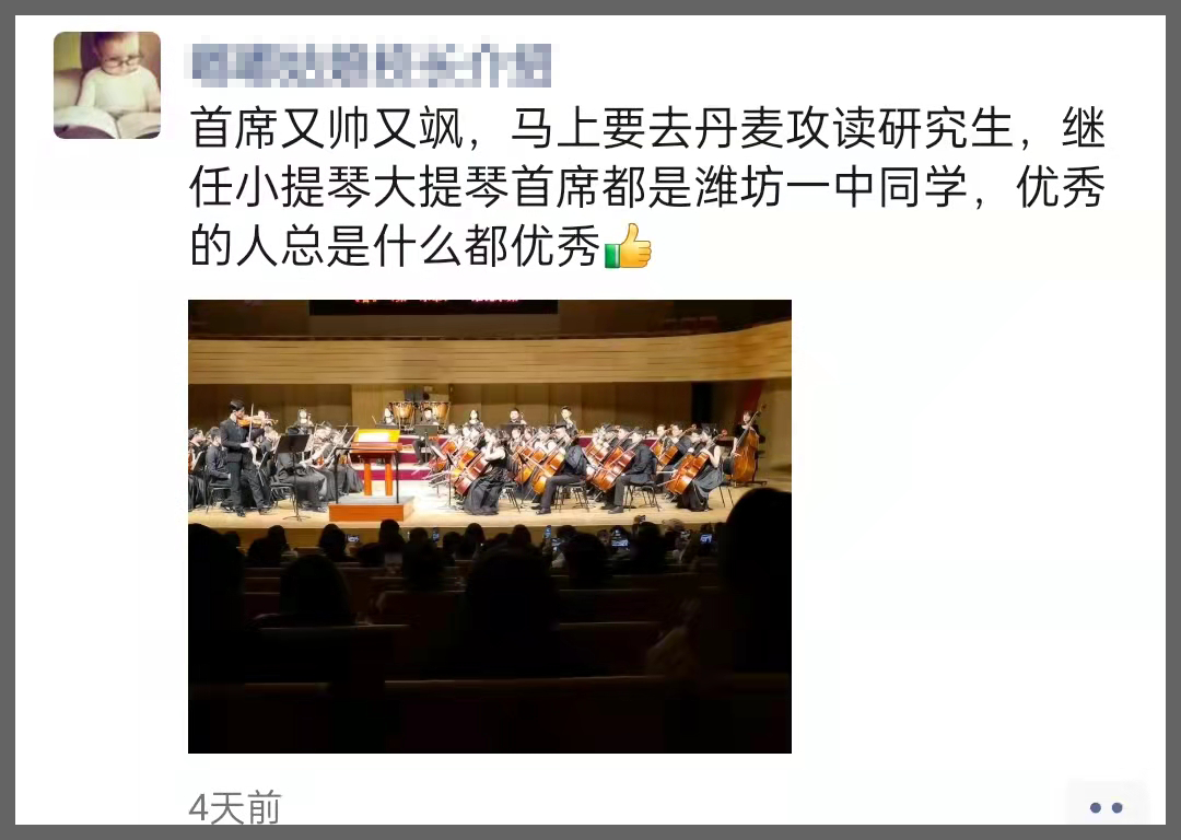 周士耀同学现就读于潍坊一中,品学兼优。而且还是位小提琴、钢琴、二胡均过10级的“多面手”。多次在我校对外演出时,既作为小提琴首席登台,也会在部分曲目中为乐团献上精彩的钢琴伴奏。
