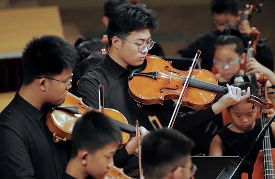 相较于前两个节目的演员小龄化,第三个节目的学员就稍微大了那么一点点,以小学生居多了。这支队伍的学员大多参与过2022年的爱乐天使新春音乐会,有过一些舞台的演奏经验。他们登台后迅速的找到自己的位置,在伴奏响起时齐齐地架琴开始演奏,作为之前登台小朋友们的学长,这队学员们的的音色也较之前的小龄学员们有明显的提升。