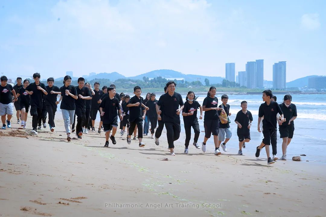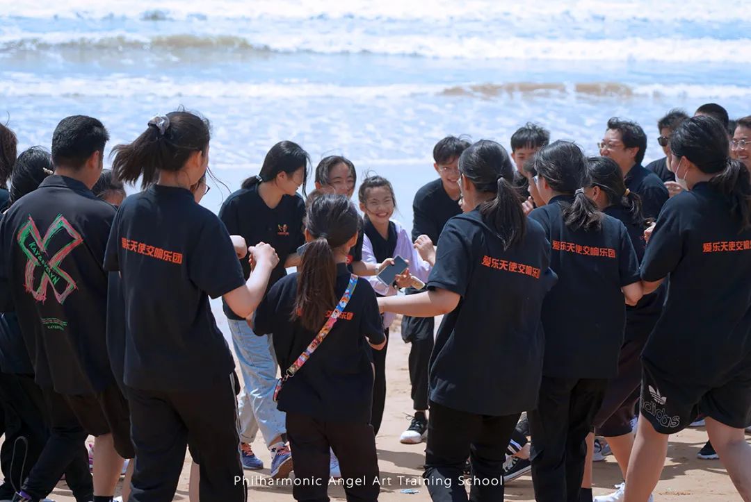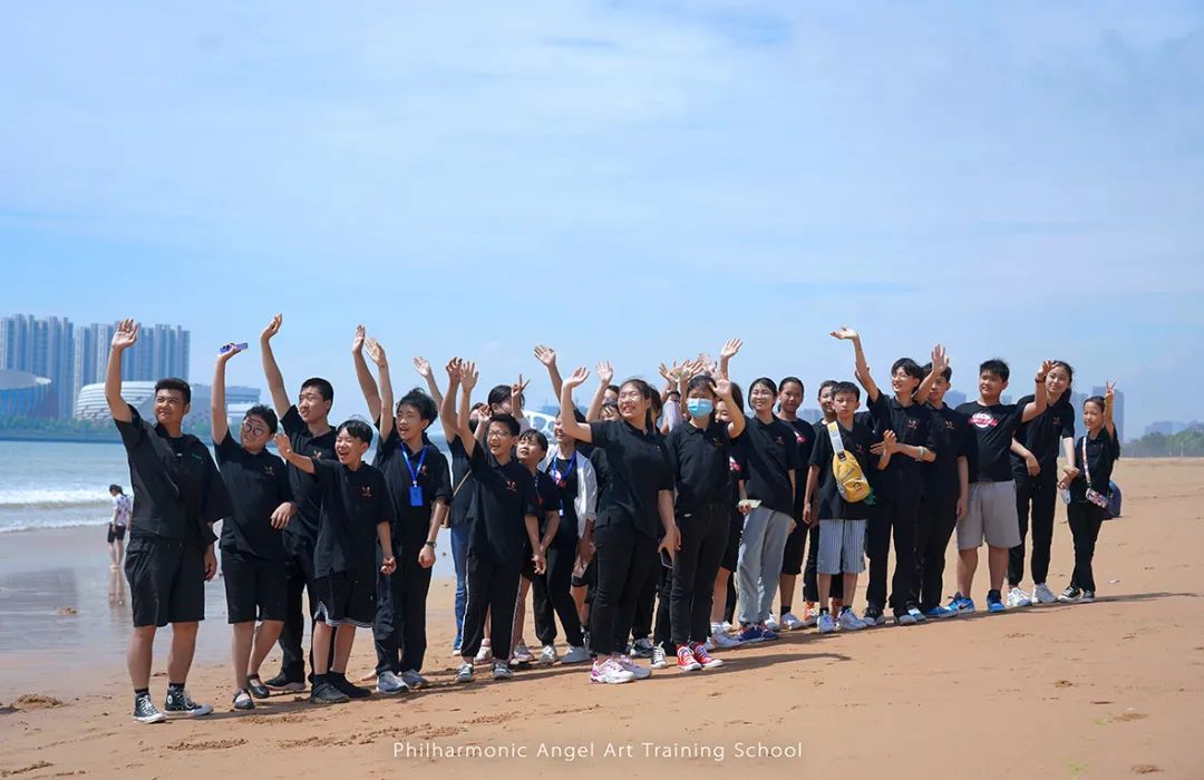 在离开之日,客车启动,张文慧校长带领收获满满的孩子们来到了沙滩上。因为之前几天的学习和演出比赛实在是太过充实和紧张,以至于孩子们虽然住在海边,但都没有出过会场大门感受美好的海景。孩子们下车后在沙滩上恣意地奔跑,无人机在天空上记录下这群爱乐天使少年阳光朝气的模样。