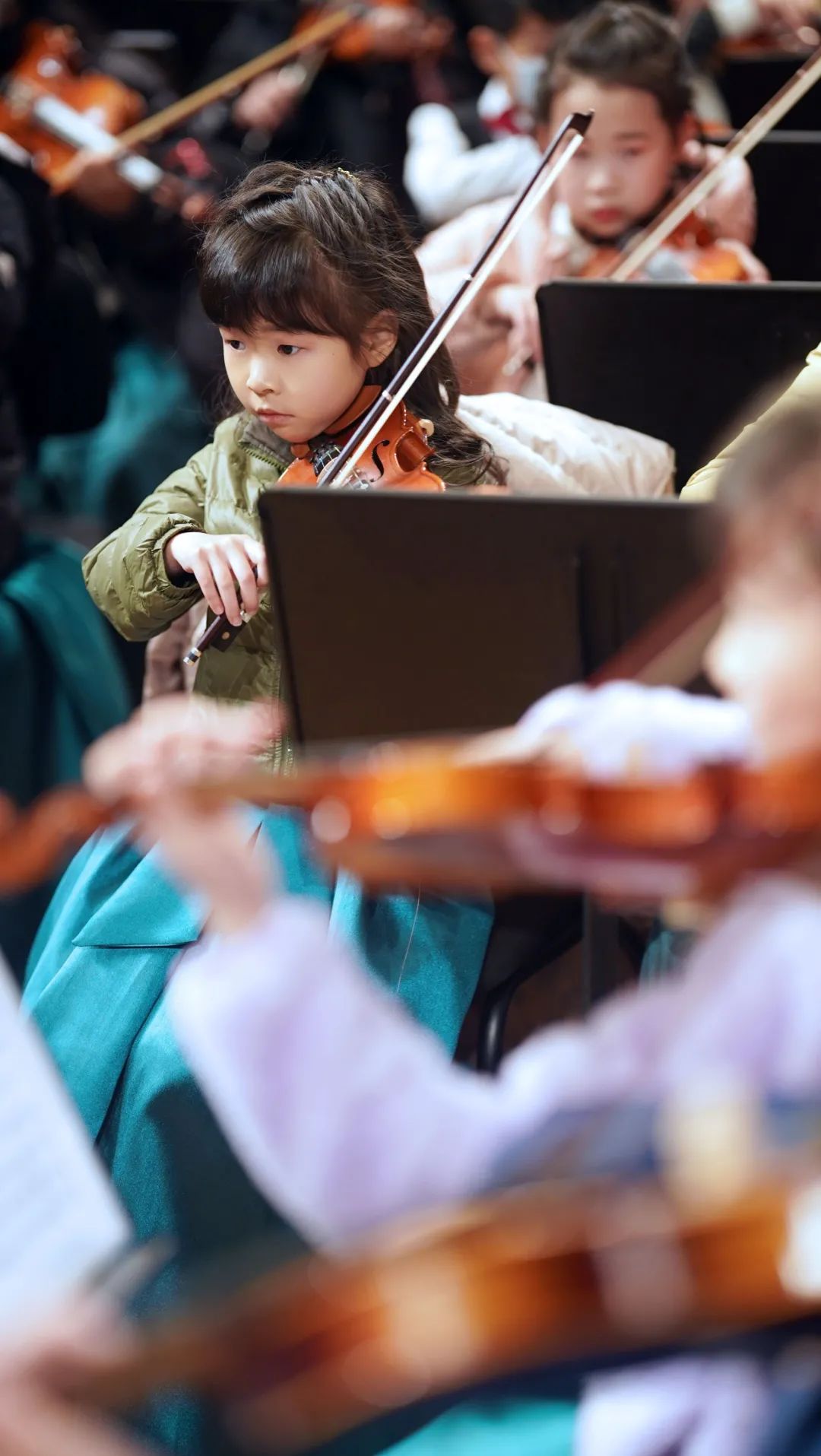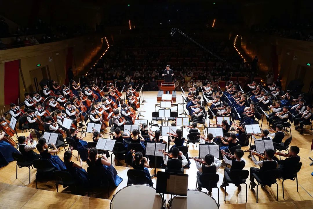 开场钟声敲响后,张文慧校长从后台走出,担任此次“爱乐天使2022新春音乐会”的指挥。他在台上向观众们介绍着此次音乐会的组成,并对C团的小朋友们褒奖有加。而接下来C团小朋友们的演出,也让所有人感到惊喜。虽然这个团年龄最小的只有5岁,却是一个近百人的大团。所有小朋友们专注的看着指挥的手势,齐齐整整的演奏,以零失误圆满完成了曲目。他们表情认真,拉的琴声稚嫩却又令人感动。