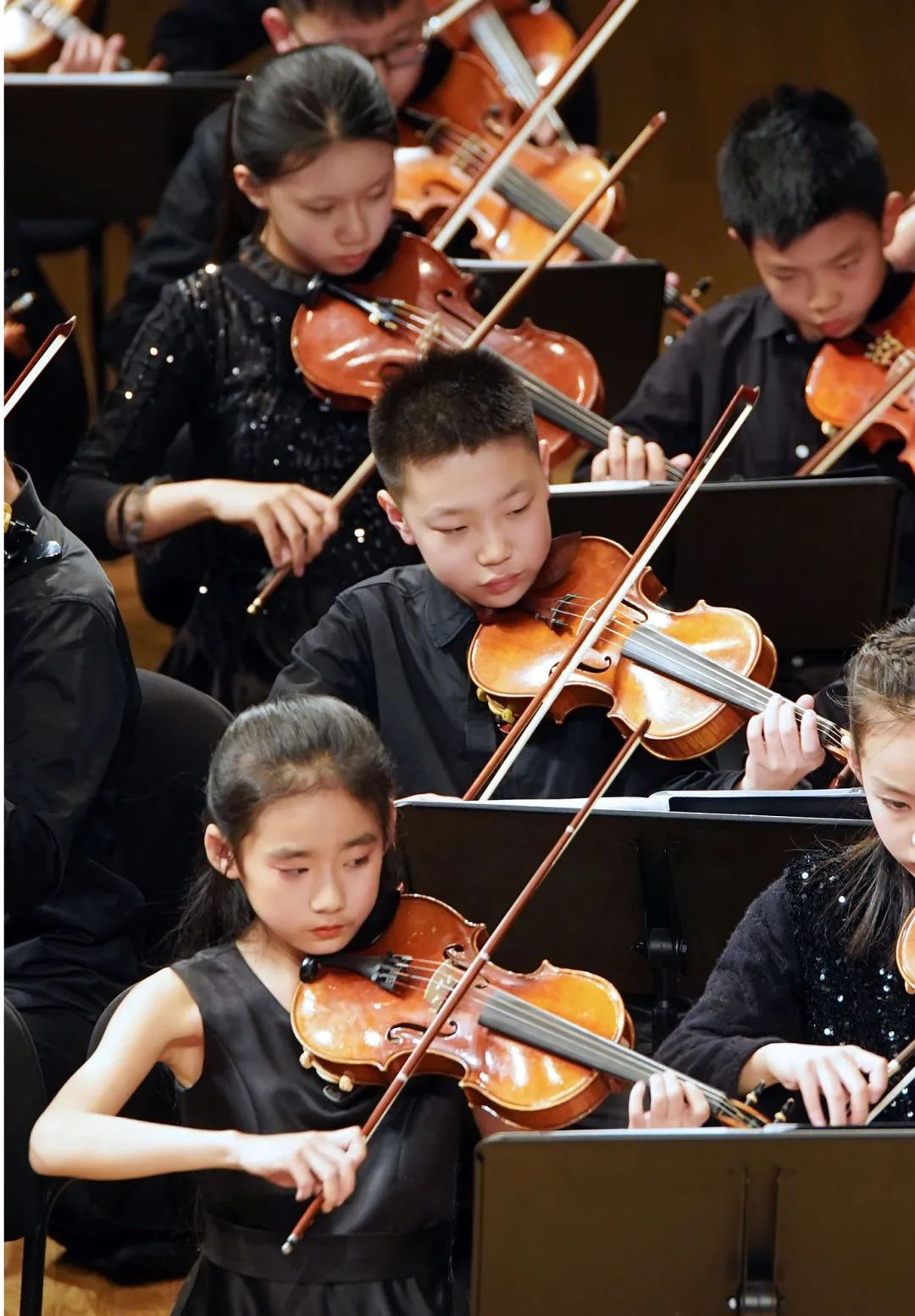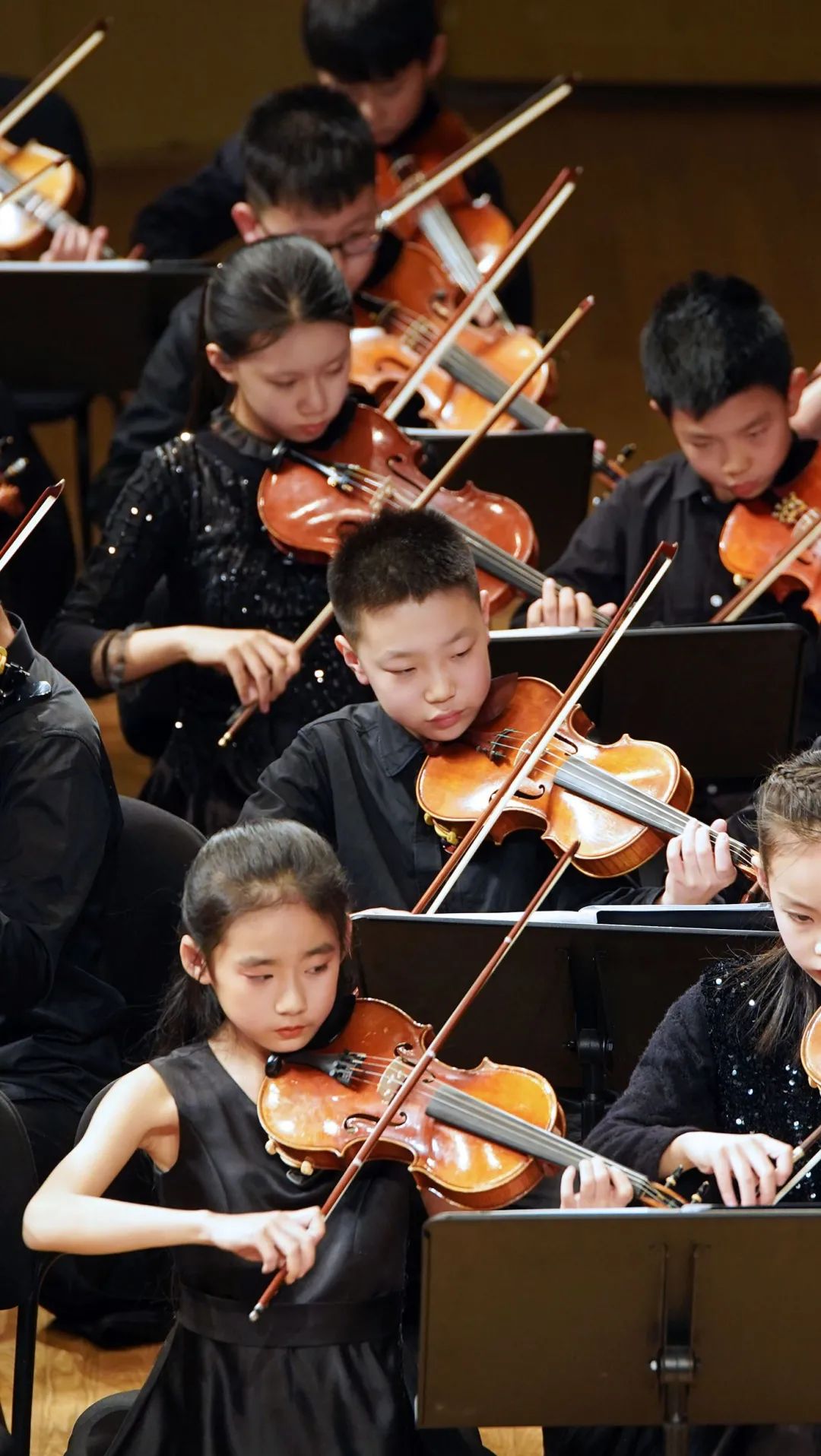 这批孩子们初中生居多,他们清一色黑色礼服,青春年少。普遍学琴年龄长程度深,是爱乐天使参与对外演出和比赛拿奖的王牌。许多A团的哥哥姐姐们拉琴好学习棒,是学校B团和C团学员们内心的“明星偶像”。