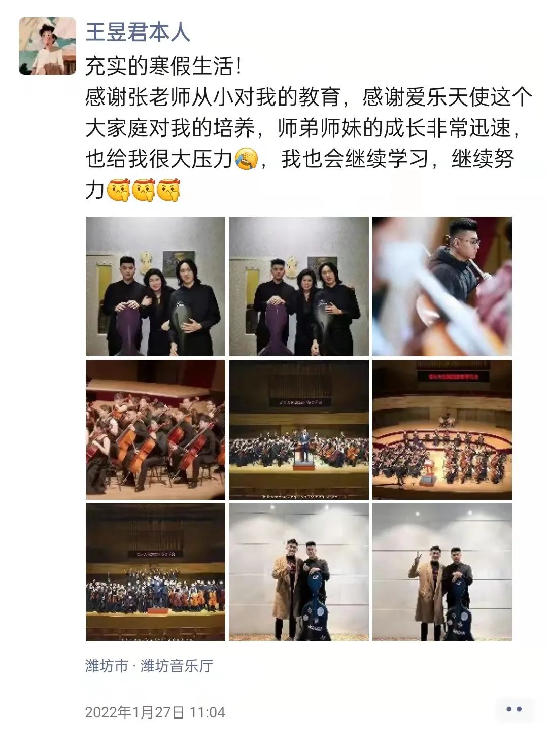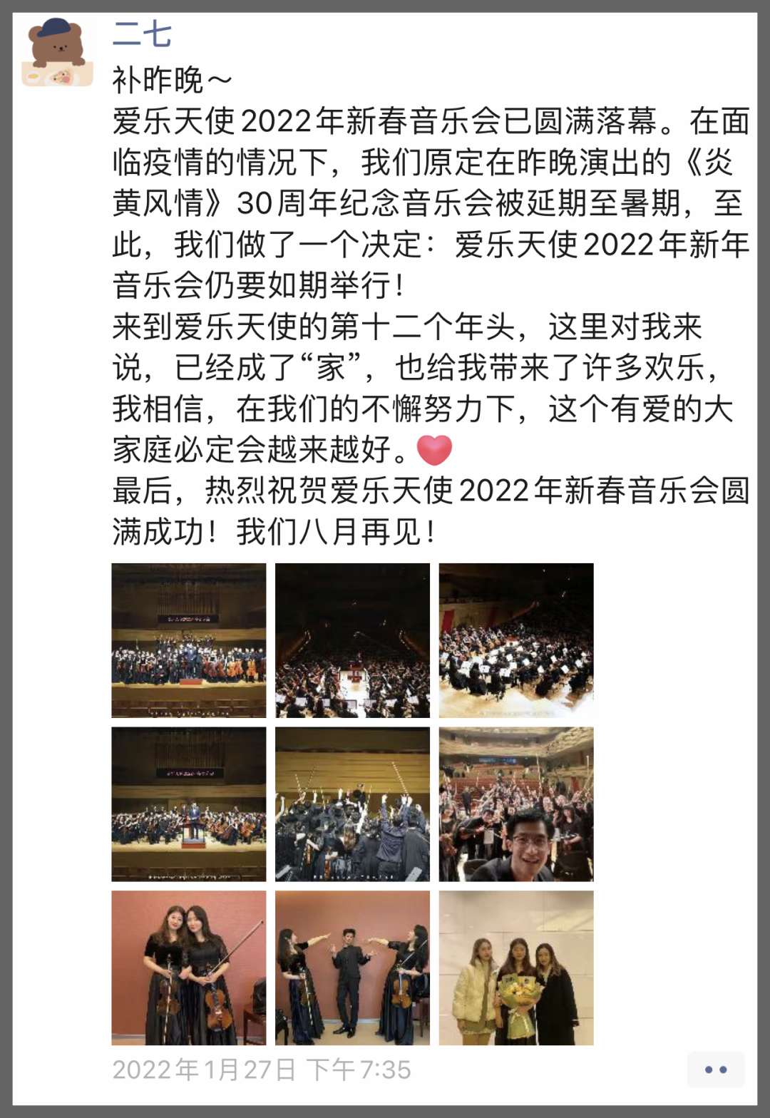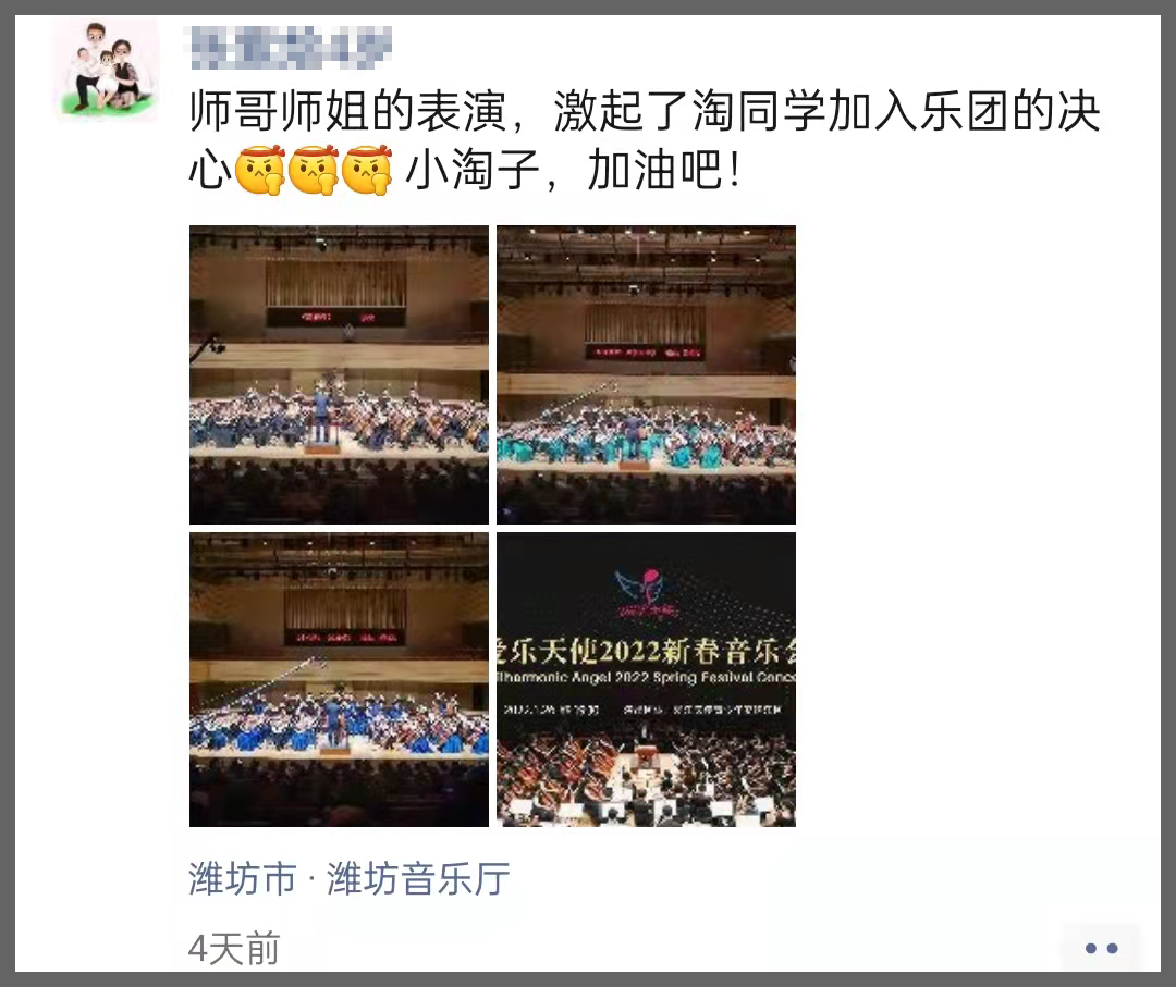 学校召开紧急会议,最终决定:在原定于26号《炎黄风情》纪念音乐会延期的同时,26号当天向潍坊大剧院额外租场继续举行音乐会。而这次音乐会,是一场完全对内的、为我们在校学员和家长献上的一场充满感谢的年终汇报演出——《爱乐天使2022新春音乐会》。