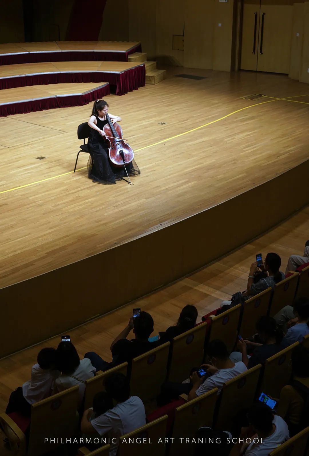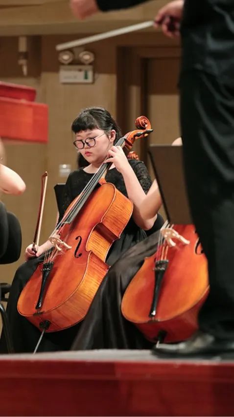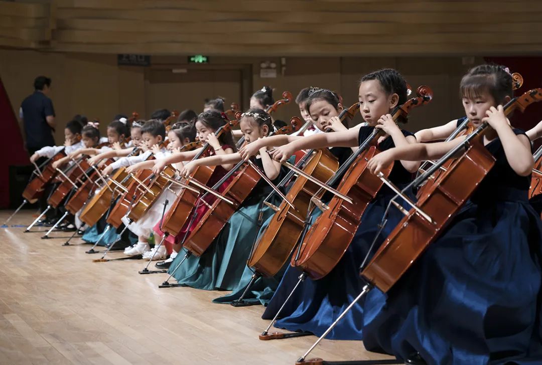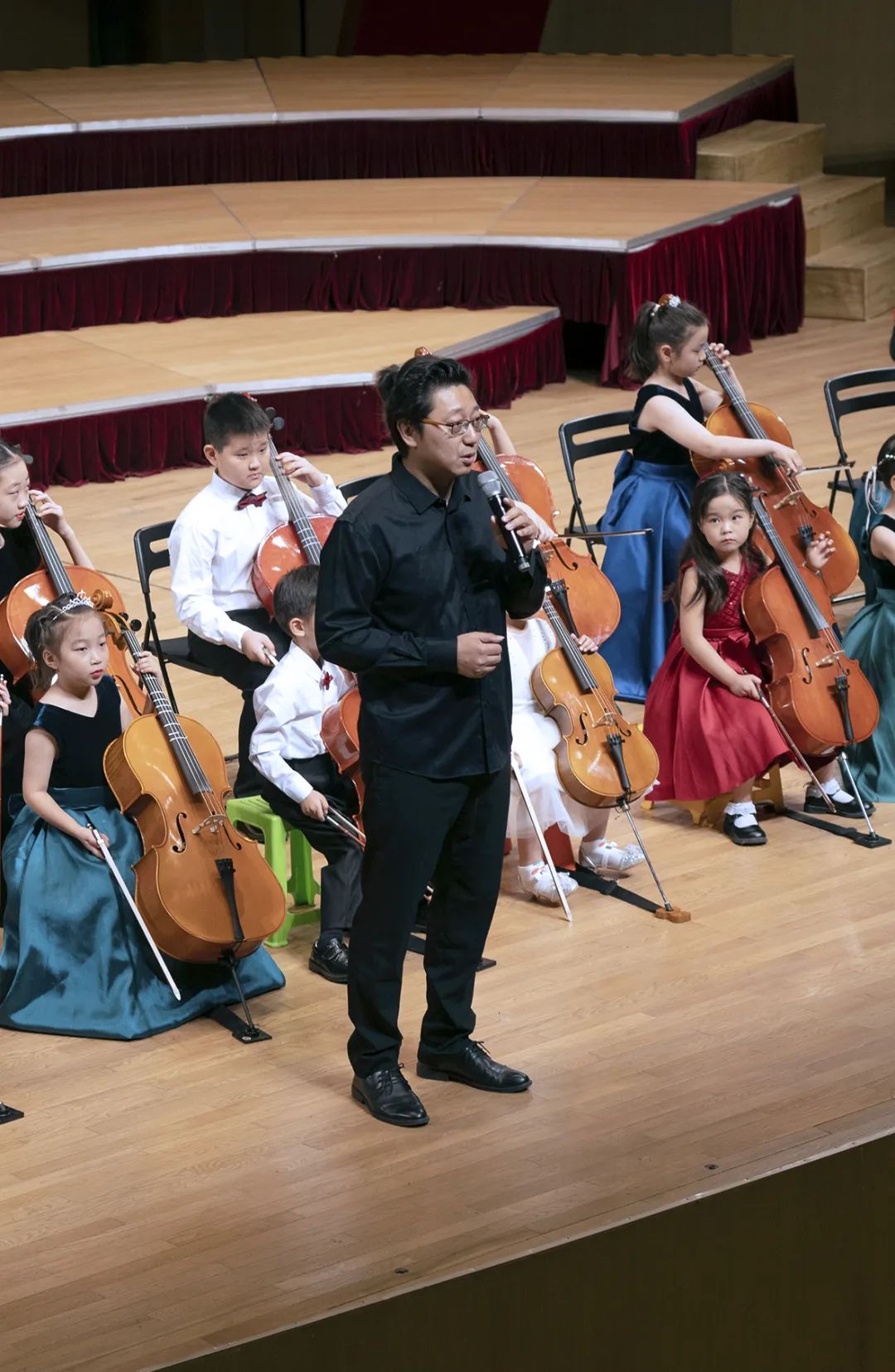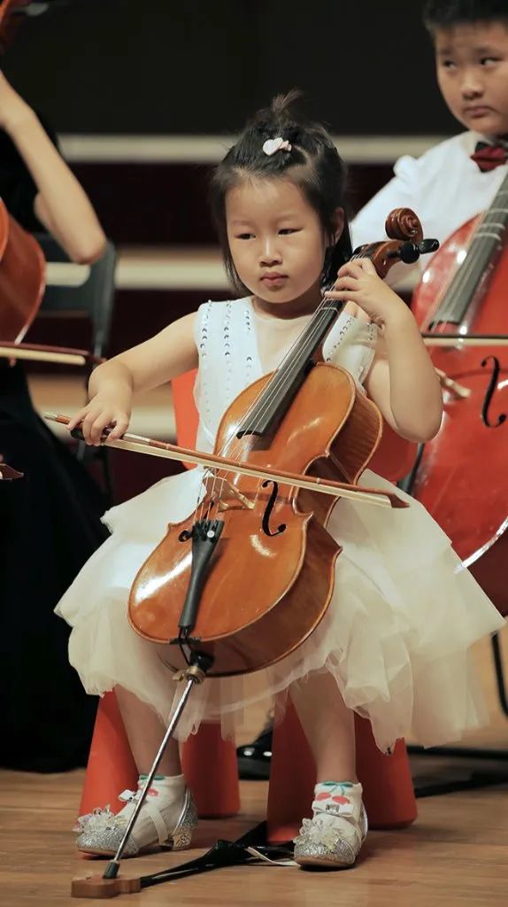 爱乐天使张文慧校长在观众的掌声中登台,对到场的观众进行了热情的问候,表达了在音乐厅舞台上与观众重逢的喜悦。同时也向台下的观众解读到,在他身后这批已整齐就坐的大提琴学员,就是本次开放日的第一个节目。这批学员中,年龄最小的只有4岁。